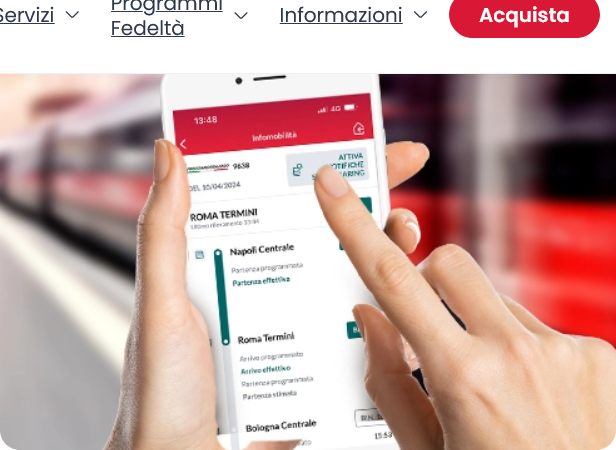 - subito dopo il pagamento del biglietto sul sito e/o App Trenitalia , attivando il servizio di aggiornamento sul proprio viaggio. In questo caso sarà possibile anche un reminder del viaggio 24 ore prima della partenza, l’informazione in tempo reale sul binario di partenza, l’andamento del proprio treno prima della partenza e dell’arrivo a destinazione.